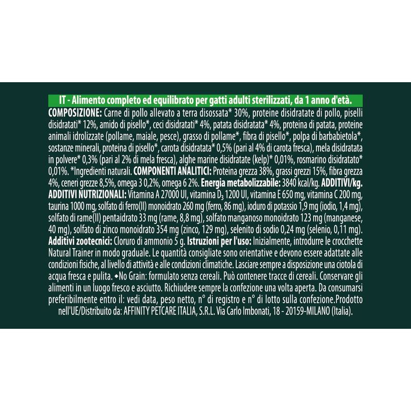 Natural Trainer Selected Gatto Sterilised No Grain Pollo è un alimento secco pensato per il benessere quotidiano dei gatti adulti sterilizzati dai 12 mesi in su. A base di carne di pollo disossata come primo ingrediente, garantisce un’elevata qualità proteica, ideale per mantenere la massa muscolare magra e supportare il metabolismo dopo la sterilizzazione. La formula, priva di cereali, è arricchita con frutta e verdura che favoriscono la digestione e l’equilibrio intestinale. Tra i benefici specifici, questo alimento aiuta a controllare il peso corporeo, supporta il tratto urinario e rafforza il sistema immunitario. Gli ingredienti chiave come carota, mela, rosmarino e alga kelp apportano fibre, antiossidanti e minerali essenziali. Il tutto in una formula gustosa, senza coloranti, conservanti e zuccheri aggiunti, perfetta anche per i gatti più sensibili.