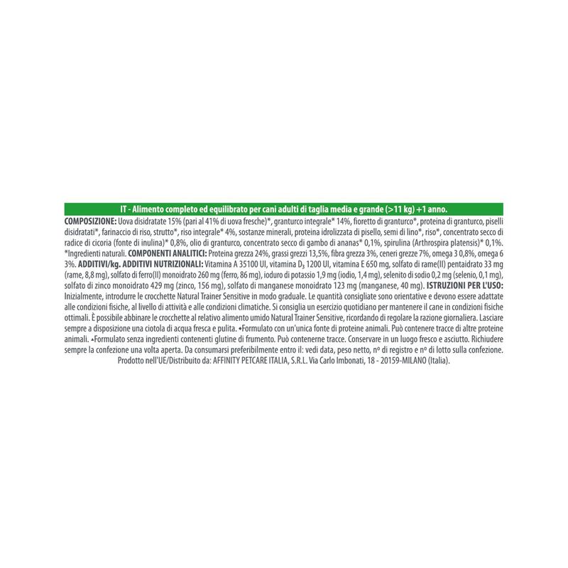 Natural Trainer Sensitive Dog No Gluten Adult Medium Maxi Uovo è un alimento secco completo ed equilibrato appositamente formulato per cani adulti di taglia media e grande con particolare sensibilità digestiva. Preparate con cura e dedizione, queste crocchette sono un concentrato di ingredienti naturali, studiati per favorire la funzionalità digestiva e promuovere il benessere generale del tuo cane. Questo alimento senza glutine e senza coloranti, conservanti e zuccheri aggiunti e con ingredienti altamente digeribili contiene l'uovo come sola fonte di proteina di alta qualità, inoltre l’estratto di ananas 100% naturale presente nella composizione di questo alimento, aggiunge un tocco di freschezza e contribuisce ad un processo digestivo più efficiente, garantendo che il tuo cane possa godere appieno di ogni pasto. I cereali integrali forniscono fibre essenziali che supportano la salute intestinale, i prebiotici stimolano la crescita di batteri benefici nell'intestino, mentre gli acidi grassi Omega 3 provenienti dai semi di lino supportano la salute della pelle e del pelo, contribuendo a mantenere il manto del tuo cane lucido e sano. Inoltre, la presenza di Boswellia serrata aiuta a prendersi cura delle articolazioni, fornendo al tuo cane il supporto necessario per mantenere una mobilità agevole e confortevole nel corso degli anni. Infine, l'alga spirulina, le proteine, i minerali e le vitamine contenute in queste crocchette aiutano a supportare la vitalità generale del tuo cane, assicurandoti di avere un compagno pieno di energia e vitalità.