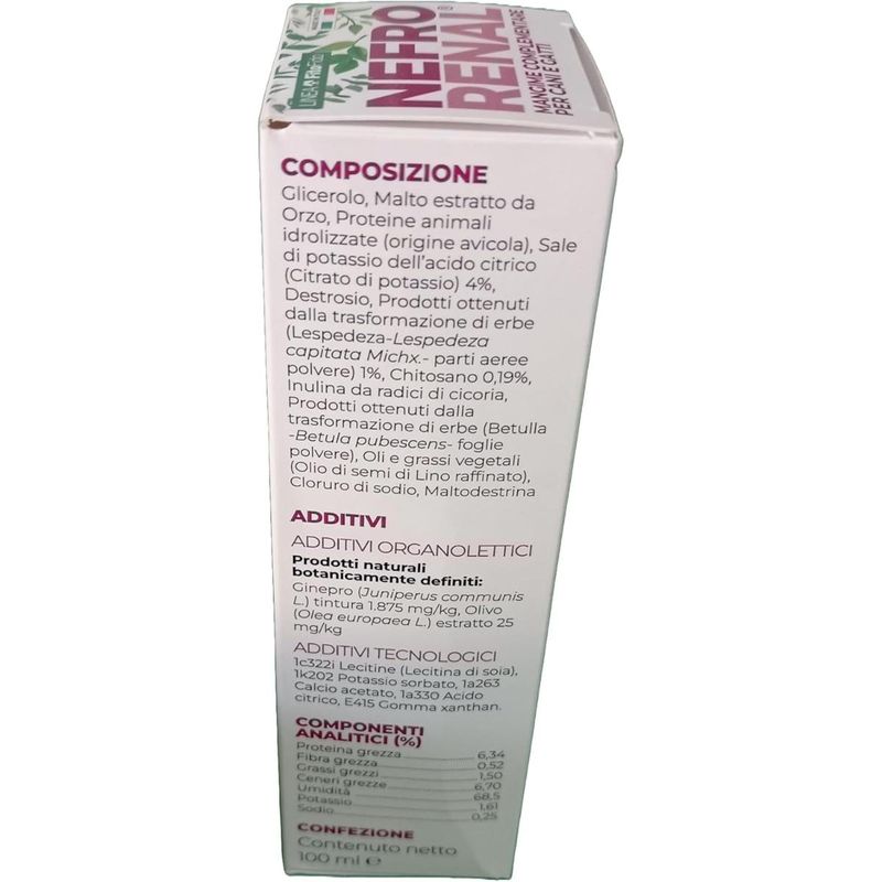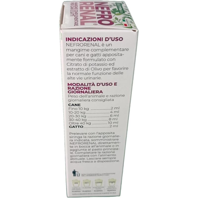 100MLNefrorenal Mangime Complementare è un mangime complementare formulato specificamente per cani e gatti, pensato per favorire la normale funzione delle alte vie urinarie. Questo prodotto contiene Citrato di Potassio ed estratto di Olivo, ingredienti selezionati per sostenere il benessere dell'apparato urinario superiore, come i reni e gli ureteri. Il Citrato di Potassio aiuta a mantenere un equilibrio ottimale nelle urine, prevenendo la formazione di calcoli e contribuendo a un ambiente urinario sano. L’estratto di Olivo è noto per le sue proprietà antiossidanti e protettive, sostenendo la funzione dei tessuti delle vie urinarie e promuovendo la loro integrità. Nefrorenal viene fornito in un flacone con siringa dosatrice multirazione, che consente una somministrazione precisa e personalizzata, garantendo il dosaggio corretto per l’animale.