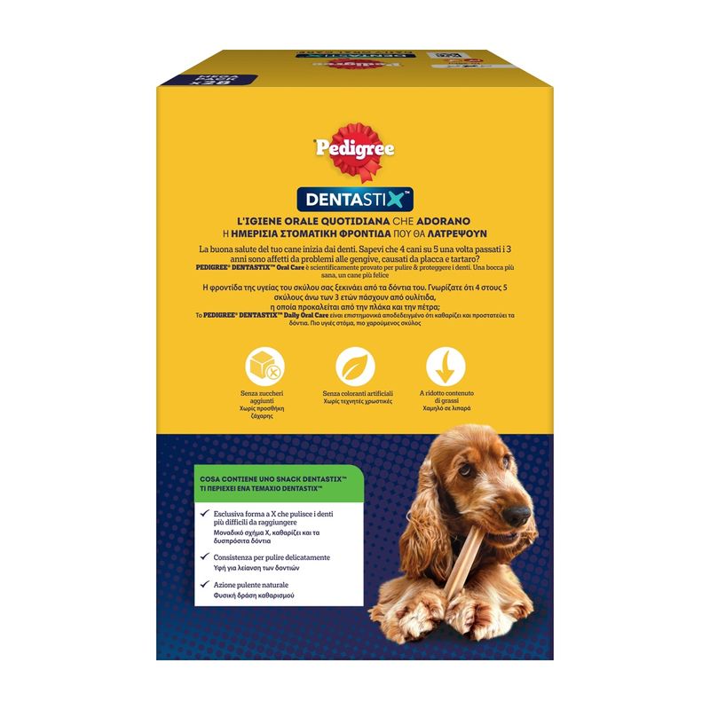 Pedigree Dentastix Daily Oral Care Medium Dog Multipack è uno snack dentale appositamente studiato per cani di taglia media dai 4 mesi in su, pensato per supportare una corretta igiene orale quotidiana. Questo snack con tripla azione è scientificamente provato per ridurre la formazione del tartaro fino all'80%, pulire anche i denti più difficili da raggiungere e contribuire a mantenere gengive sane, aiutando così a prevenire i problemi gengivali comuni nei cani. Inoltre, è prodotto senza zuccheri aggiunti, senza coloranti e aromi artificiali, con un contenuto di grassi ridotto per garantire uno snack sano e gustoso. Grazie a questa formula esclusiva, ogni momento di coccola diventa un gesto utile per la salute orale del tuo cane.