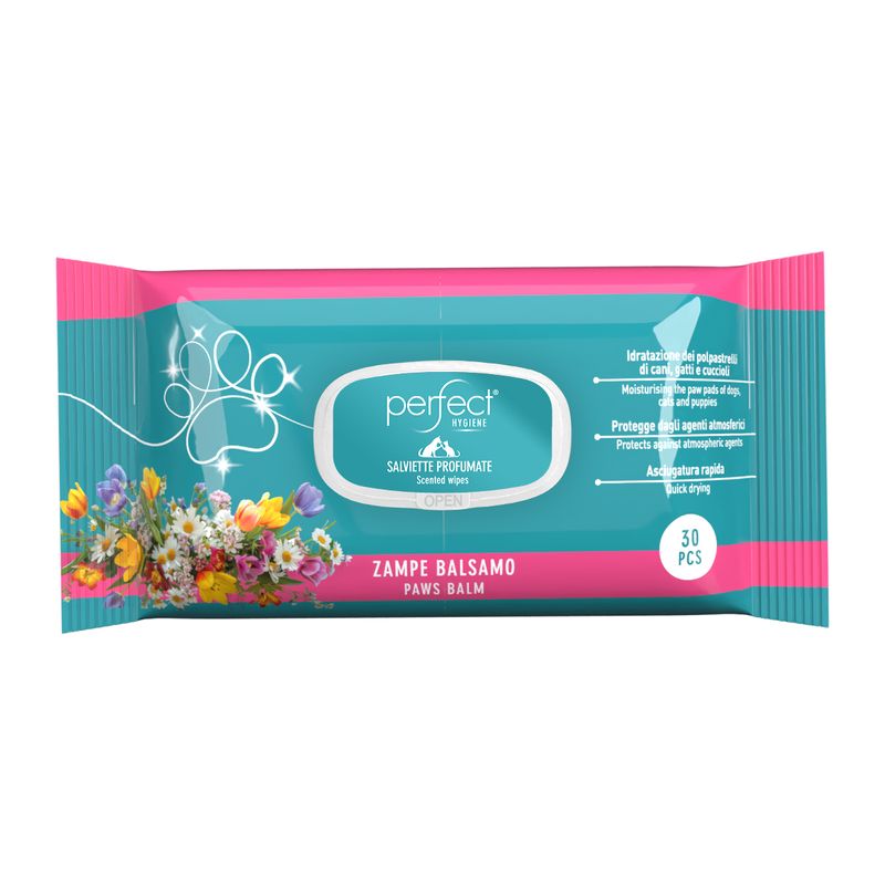 30PZPerfect Hygiene Salviette Cane Balsamo per Zampe 30PZ sono ideali per la cura e l’idratazione dei polpastrelli di cani, gatti e cuccioli, offrendo protezione e comfort quotidiano.