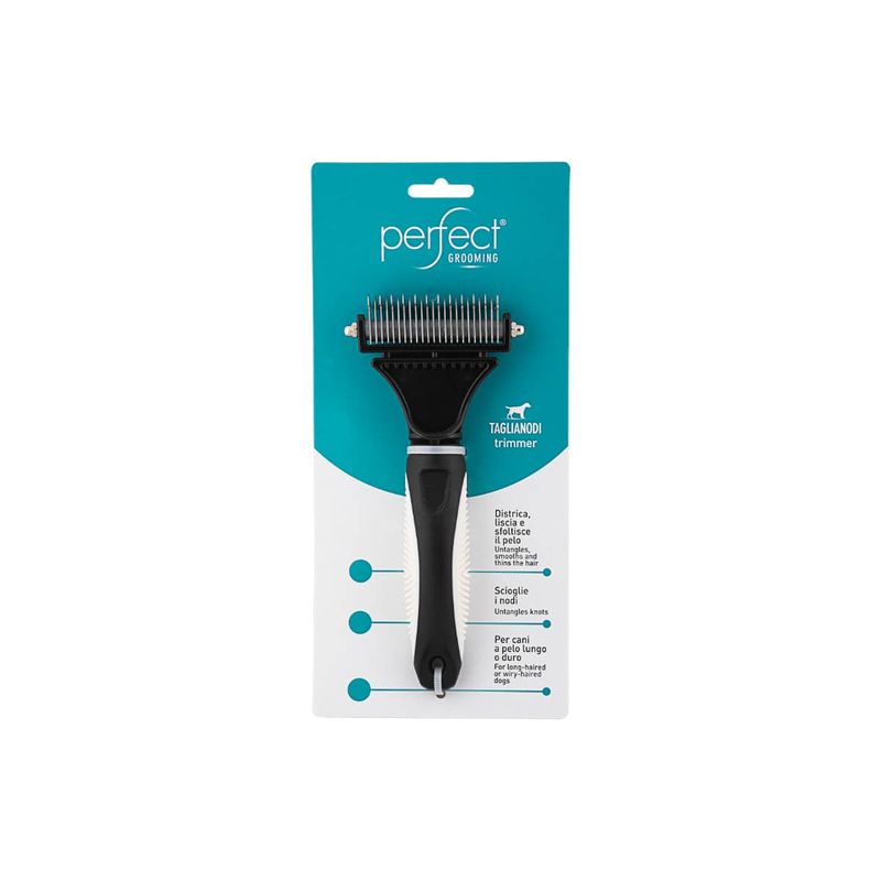 Trimmer è un Taglianodi per Cani ideale per districare e lisciare il pelo del tuo fedele amico a quattro zampe. Il prodotto è stato studiato in modo specifico per la tolettatura di cani a pelo lungo o duro. I dentini hanno una doppia funzione, quella di tagliare i nodi che si vanno a creare sui peli e districano il sottopelo. Il manico della spazzola Trimmer è stato rivestito in gomma antiscivolo per una presa più sicura. Il prodotto è indicato per le seguenti razze di cani: Labrador, Golden Retriever, Breton | Brittany, Akita Inu | Akita, Samoiedo | Samoyed, Bassotto a pelo lungo | Long-haired Dachshund, Terranova | Newfoundland, Pastore Tedesco e Australiano | German and Australian Shepherd, Bovaro del Bernese | Bernese Mountain Dog, Setter Inglese/Irlandese | English/Irish Setter. Consigli d'utilizzo: utilizzare con cautela non più di una o due volte a settimana. Non spingere eccessivamente durante l'utilizzo.