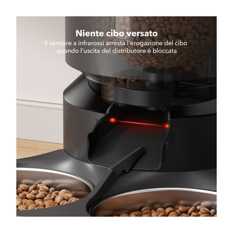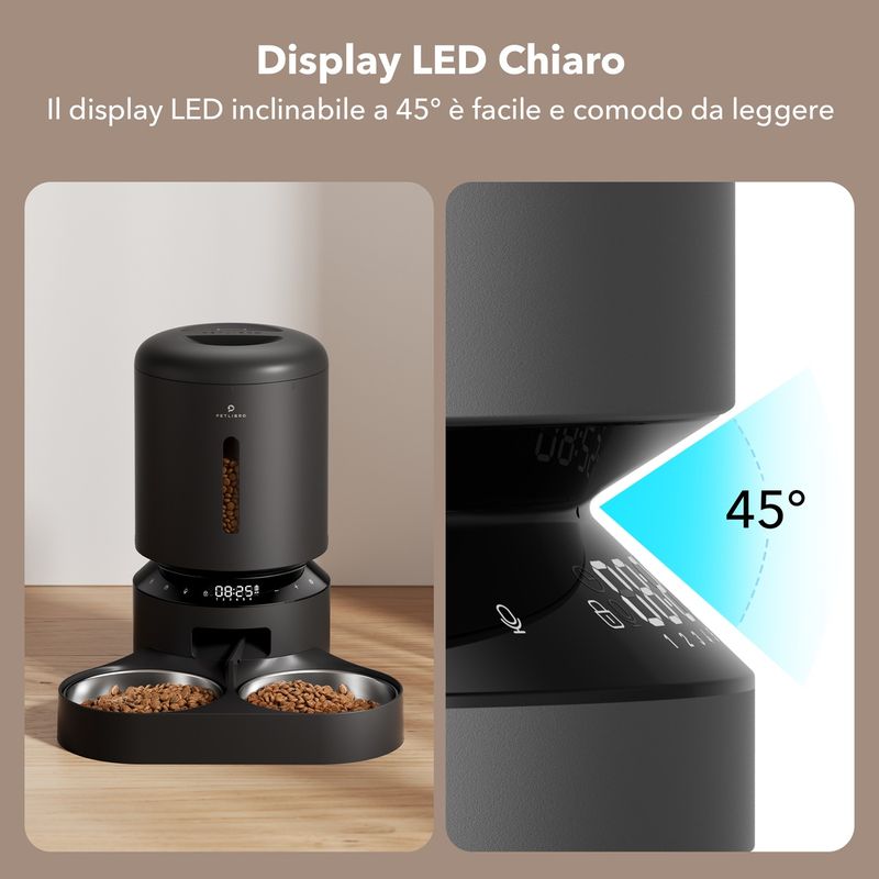 Petlibro Gatto Distributore Cibo Granary Automatico Doppio è la soluzione smart e stilosa per nutrire due gatti o cani di piccola taglia contemporaneamente, senza stress. Il suo design moderno ospita un display LED con pannello touch che ti consente di programmare fino a 6 pasti giornalieri, regolando la quantità in base alle esigenze specifiche dei tuoi animali. Il sistema di distribuzione con doppia ciotola in acciaio inox e divisore regolabile assicura una porzione uniforme per entrambi i pet, evitando litigi e garantendo una dieta equilibrata. Il cibo è conservato in modo ottimale grazie al contenitore ermetico con sacchetto disidratante, che mantiene le crocchette asciutte e fragranti. Il distributore funziona anche in caso di assenza di corrente grazie alla doppia alimentazione (cavo e batterie), mentre la funzione di registrazione vocale consente di riprodurre un messaggio al momento del pasto, rendendo l’esperienza più rassicurante per gli animali. E sì, è anche facilissimo da montare e pulire!