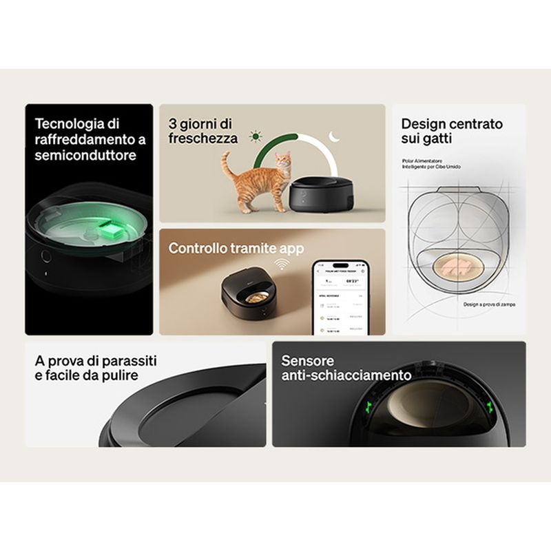Petlibro Gatto Distributore Cibo Umido Automatico Polar è il primo del suo genere: un distributore refrigerato progettato per garantire freschezza del cibo umido fino a 3 giorni. Pensato per gatti e cani di piccola taglia, questo innovativo dispositivo utilizza tecnologia a semiconduttori per raffreddare il pasto fino a sotto i 10°C in sole 4 ore, mantenendolo perfettamente conservato. L'app dedicata ti consente di gestire facilmente la programmazione dei pasti, ricevere notifiche e controllare lo stato in tempo reale. Il design intelligente è dotato di protezione anti-formiche, sensore anti-schiacciamento del coperchio, pulsanti a prova di zampa e blocco anti-manomissione, per garantire la massima igiene e sicurezza. Grazie alla protezione batteria di emergenza, il piano alimentare rimane attivo fino a 12 ore anche in caso di blackout. E con un consumo di soli 60W, è anche una scelta ecologica ed efficiente. La ciotola interna è facile da rimuovere e pulire, mentre le guarnizioni a chiusura ermetica prevengono perdite e odori. Il distributore è perfetto per chi vuole offrire solo il meglio in termini di freschezza e controllo, senza rinunciare alla comodità.