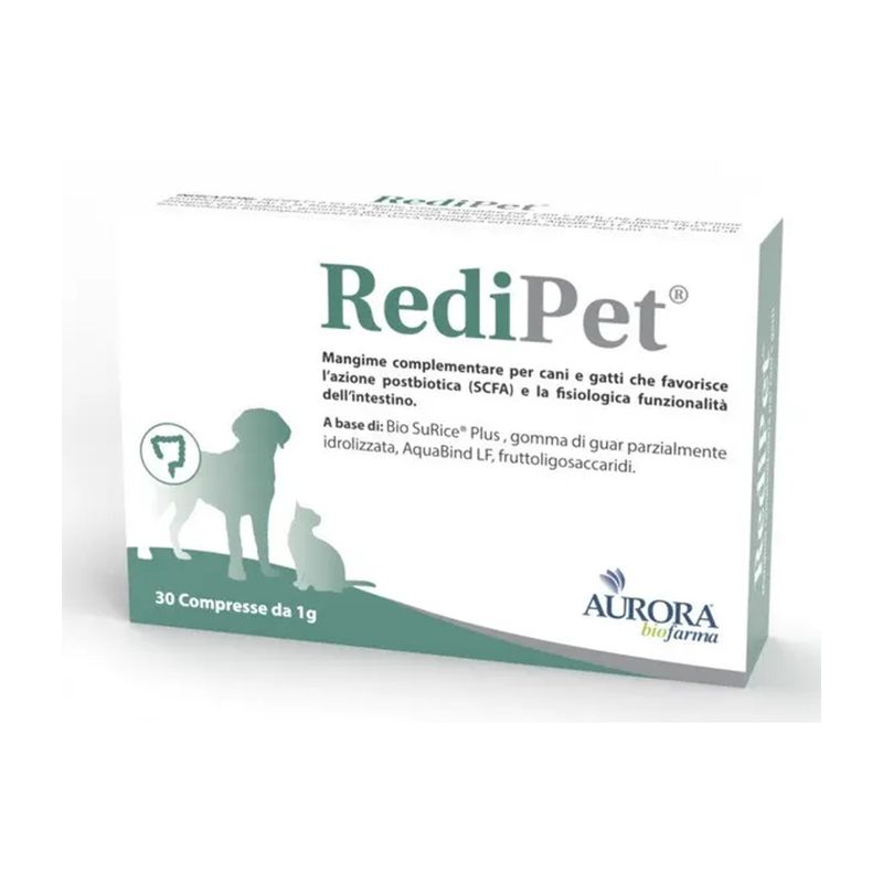 Redipet Mangime Complementare per Cani e Gatti è un mangime complementare in compresse appetibili, formulato per supportare la funzionalità gastrointestinale grazie all’azione mirata dei postbiotici e di ingredienti naturali ad alta efficacia. Appartiene alla categoria alimento secco e si rivolge a cani e gatti di tutte le età, in particolare in presenza di disturbi intestinali come diarrea, feci molli o meteorismo. Tra i benefici principali c’è il miglioramento della salute intestinale e dell’equilibrio della flora batterica. Offre un valido supporto postbiotico, oltre a svolgere un’azione lenitiva e protettiva sulla mucosa. La sua formula esclusiva contiene Bio SuRice, un estratto di riso integrale germogliato che contribuisce alla rigenerazione dell’epitelio intestinale e contrasta lo stress ossidativo. L’Aquabind LF, a base di semi di lino dorati, regola il volume delle feci, mentre la gomma di guar e i fruttoligosaccaridi (FOS) migliorano la consistenza delle feci e favoriscono l’equilibrio microbico. Completa la formula la Yucca schidigera, che riduce l’ammoniaca e i gas intestinali. Il tutto è privo di componenti irritanti o inutili, risultando senza coloranti, conservanti e zuccheri aggiunti, ideale anche per animali con intestini sensibili.