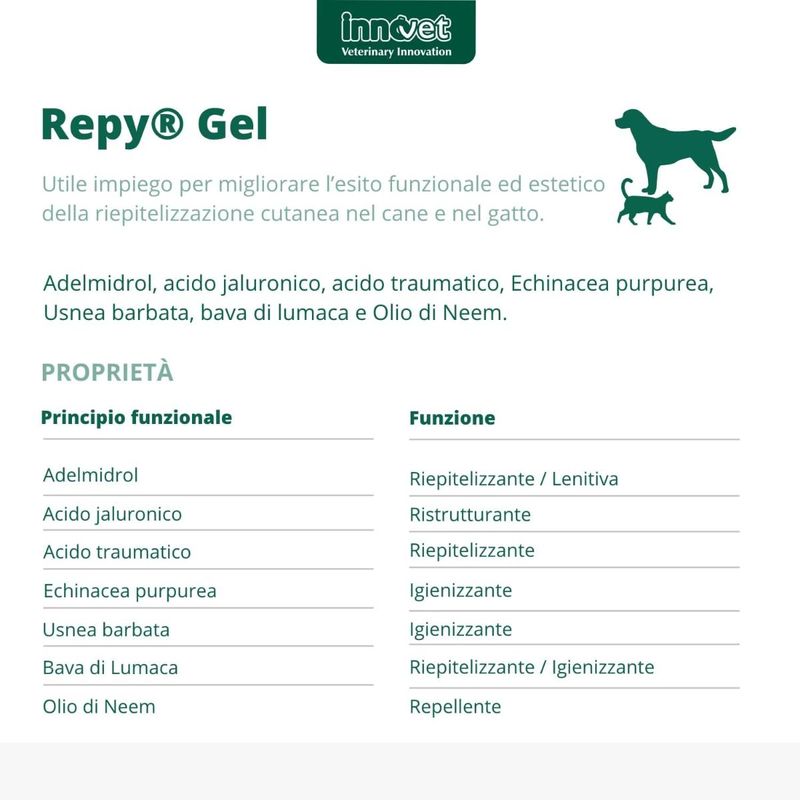 Repy Gel è un gel dermatologico innovativo per la riepitelizzazione cutanea di cani e gatti. Pur non essendo un farmaco veterinario, rappresenta un prodotto dermatologico di alta qualità, ideale per favorire il processo di rigenerazione della pelle, mantenendo al contempo l’integrità e l’elasticità dei tessuti cutanei. La sua formulazione avanzata include Adelmidrol, un analogo della palmitoiletanolamide, che ottimizza la riepitelizzazione e migliora l’elasticità della cute, svolgendo allo stesso tempo un’efficace azione lenitiva e anti-arrossamento, particolarmente utile in caso di irritazioni o stress cutanei. Il prodotto è arricchito con acido ialuronico e acido traumatico, ingredienti chiave per mantenere l’idratazione e l’elasticità della pelle, supportando così un recupero cutaneo più rapido ed efficace. La presenza di un complesso di estratti vegetali, tra cui Echinacea purpurea e Usnea barbata, contribuisce a preservare l’equilibrio della microflora superficiale, essenziale per la salute della cute. La bava di lumaca, nota per le sue proprietà rigenerative, completa l’azione protettiva e lenitiva. Grazie all’aggiunta di Olio di Neem, Repy Gel non solo favorisce il processo di guarigione della cute, ma offre anche un’azione repellente naturale contro insetti fastidiosi, come le mosche, e scoraggia il leccamento da parte dell’animale, facilitando così l’applicazione e l’efficacia del trattamento.