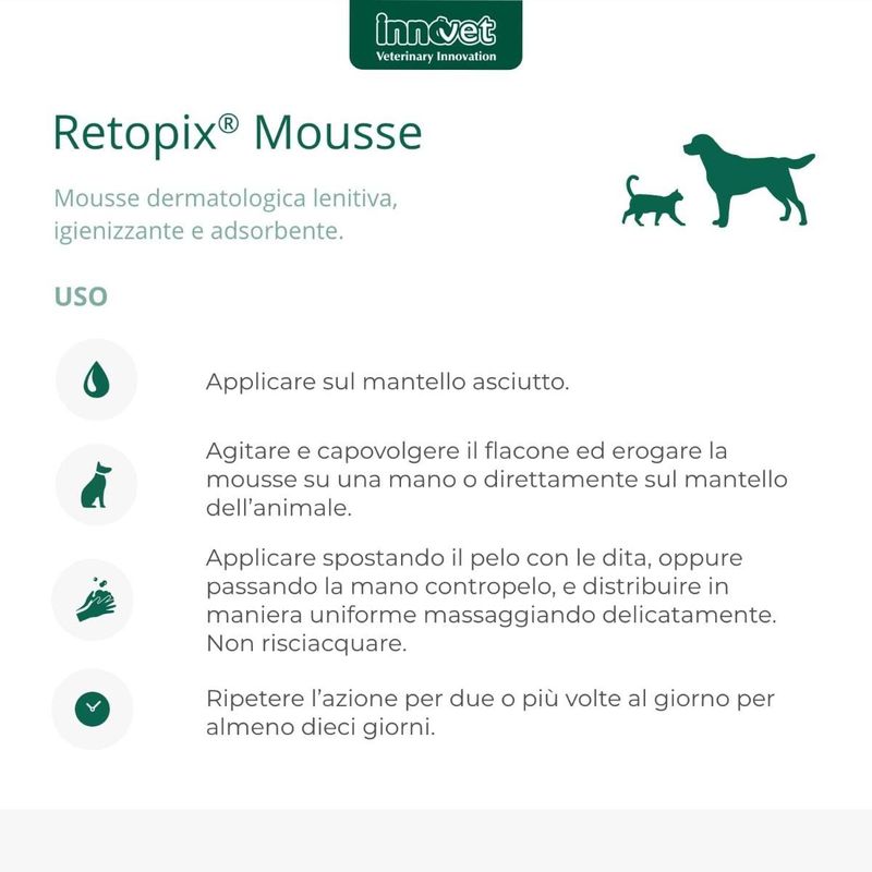 RetopiX Mousse non è un farmaco veterinario, ma un prodotto dermatologico per cani e gatti.