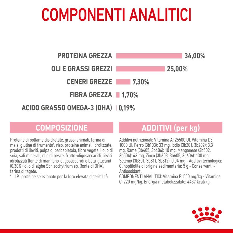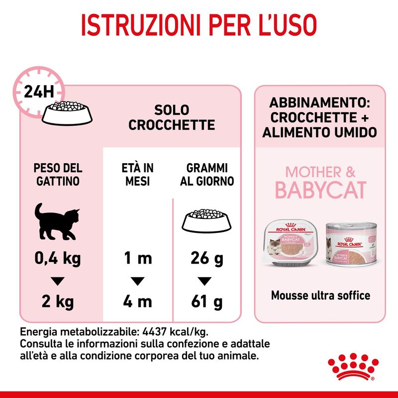 Royal Canin Mother & Babycat Alimento completo per gatte e gattini da 1 a 4 mesi di età è formulato appositamente per rispondere alle esigenze nutrizionali e soddisfa gli elevati fabbisogni energetici della gatta dalla fine della gestazione e durante la lattazione. È inoltre formulato per supportare la crescita dei gattini fino ai 4 mesi di età. Contiene livelli adattati di proteine, sali minerali e vitamine per soddisfare gli elevati fabbisogni energetici e supportare lo sviluppo di ossa e muscoli del tuo gattino. Contiene inoltre vitamina C e vitamina E che contribuiscono allo sviluppo delle difese naturali nel gattino e della madre. Questo alimeno è inoltre arricchito con acidi grassi omega-3 (DHA) per supportare lo sviluppo cerebrale e della vista del gattino. Grazie a una combinazione di prebiotici (MOS) e proteine altamente digeribili, Royal Canin Kitten favorisce l’equilibrio del microbiota intestinale a supporto della salute digestiva. Le crocchette sono state inoltre appositamente pensate per adattarsi alla piccola bocca dei gattini. Grazie all’azione meccanica di pulizia esercitata durante la masticazione si promuove l’igiene orale del gattino. Seguire una dieta equilibrata è più agevole per il tuo peloso quando il cibo rispecchia le sue preferenze naturali. Formulato per rispettare il profilo macro-nutrizionale istintivamente preferito dai pelosi, promuovendo così il consumo del pasto e l'assunzione degli elementi nutritivi essenziali per la salute. La formulazione contiene antiossidanti naturali ed è priva di coloranti ed aromi artificiali.