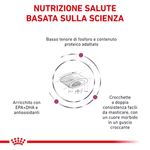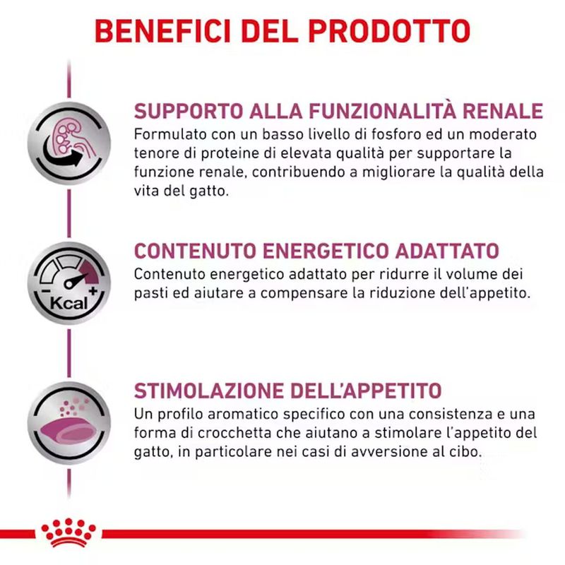 Royal Canin V-Diet Renal Select Gatto è un alimento secco dietetico, completo e bilanciato, progettato specificamente sono state formulate per supportare la funzione renale nei gatti con insufficienza renale cronica. Questo alimento è arricchito con EPA e DHA, acidi grassi essenziali che contribuiscono al benessere generale, e con un complesso di antiossidanti che proteggono l’organismo dai danni dei radicali liberi. Inoltre, contengono un basso livello di fosforo, essenziale per ridurre il carico sui reni e prevenire il deterioramento della funzione renale. L’alto contenuto di proteine di alta qualità aiuta ad alleggerire il carico renale, riducendo il rischio di crisi uremiche. Inoltre, l’elevata densità energetica delle crocchette contrasta l’eccessiva perdita di peso, un problema comune nei gatti con insufficienza renale cronica. Un altro vantaggio importante è che queste crocchette stimolano l’appetito del gatto grazie al loro profilo aromatico specifico, alla forma e alla consistenza, che le rendono particolarmente appetibili, anche per i gatti che tendono a rifiutare il cibo.