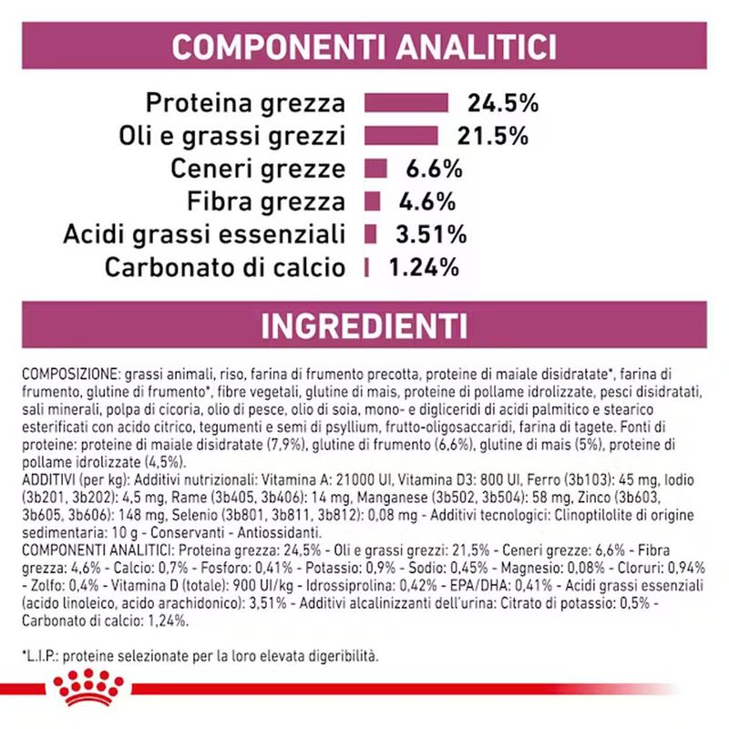 2KGRoyal Canin V-Diet offre anche diverse gamme di alimenti dietetici completi appositamente formulati per favorire la salute e il benessere di cani affetti da specifiche patologie, diagnosticate da un Medico Veterinario, riguardanti: malattie delle basse vie urinarie, gestione del peso, diabete mellito, reazioni avverse al cibo, dermatosi e perdita eccessiva di peli, disturbi gastro intestinali e supporto alla funzionalità renale.