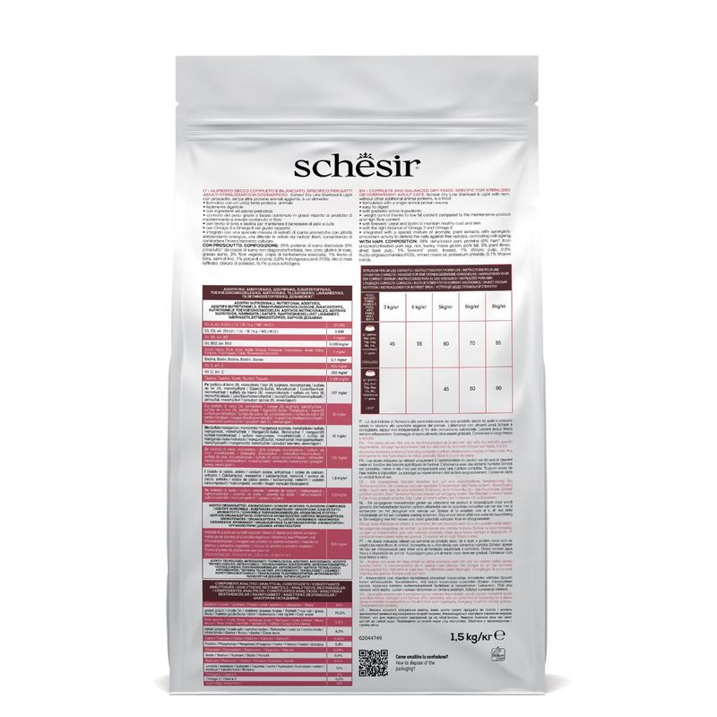Schesir Cat Sterilized & Light al Prosciutto, per gatti adulti sterilizzati o tendenti al sovrappeso nel regime di mantenimento o di riduzione del peso, con ingredienti selezionati e naturali al 100%, è un alimento secco completo e bilanciato. Questo alimento senza conservanti e coloranti aggiunti contiene suino, come unica fonte di proteina animale di alta qualità e arrichito con Vitamina A e Vitamina E di altissima qualità per un supporto nutrizionale ottimale per il benessere complessivo del tuo felino. L'impiego di una sola fonte di proteine animali può aiutare a ridurre la possibilità di contrarre allergie o intolleranze alimentari. Inoltre, questa prelibatezza contiene taurina, un amminoacido essenziale per il benessere del tuo gatto, promuovendo il corretto funzionamento cardiaco e una visione ottimale e acidi grassi insaturi Omega-3 e Omega-6 presenti nell'alimento contribuiscono a mantenere un pelo splendente e una pelle sana, garantendo al tuo gatto un aspetto radiante e ben curato. Le crocchette di Schesir contengono ingredienti ad azione prebiotica per il controllo del peso grazie al basso contenuto in grassi e con un elevato contenuto in fibre. Ogni boccone Schesir Cat è un capolavoro gastronomico progettato su misura per soddisfare le esigenze nutrizionali specifiche del tuo felino.