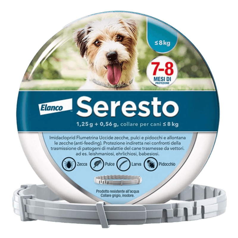 È un collare antiparassitario per cani e per gatti che rappresenta un rimedio semplice e pratico al problema delle pulci (e larve di pulce nell’ambiente circostante l’animale trattato) e delle zecche (larve, ninfe e zecche adulte) offrendo fino ad 8 mesi di protezione con un’unica applicazione. Seresto inoltre fornisce un’attività repellente contro le zecche, impedendo così ai parassiti repulsi di assumere un pasto di sangue.