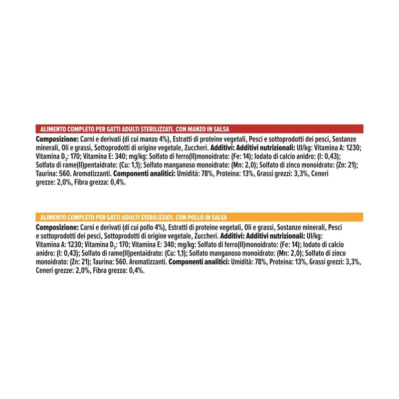 Multipack 24x85G Sterilised in Salsa– 12 buste con Manzo, 12 buste con Pollo.