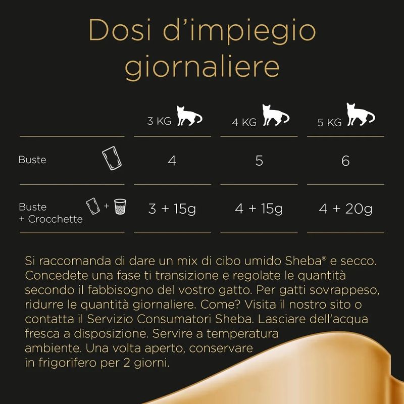 Composizione: Carni e derivati* (95% naturale), Pesci e sottoprodotti dei pesci* (di cui salmone 4% nei bocconcini**), Cereali, Sostanze minerali, Sottoprodotti di origine vegetale, Estratti di proteine vegetali, Zuccheri. *Naturale, **Bocconcini 40% del prodotto.