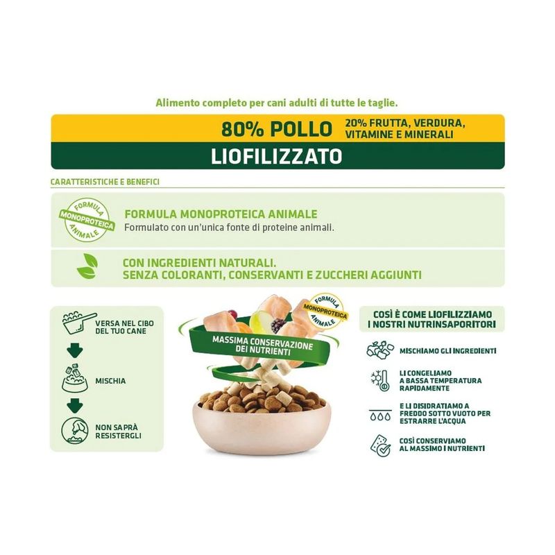 Il Set Prova Multigusto 4x120G Natural Trainer Dog NutrInsaporitore è un insaporitore formulato al 100% carne liofilizzata, sano e naturale dedicato al tuo cane adulto. Formulato con un’unica fonte di proteine animali. Contiene l'80% di carne e il 20% di frutta, verdura, vitamine e minerali, indispensabili per la salute del tuo amico peloso. Con ingredienti naturali, senza coloranti, conservanti e zuccheri aggiunti. Il processo della liofilizzazione avviene cosi: si tagliano tutti gli ingredienti presenti nella ricetta, dopo vengono congelati a bassa temperatura rapidamente, successivamente vengono disidratati a freddo sotto vuoto per estrarne l'acqua. Facendo così si conservano tutti i nutrienti degli ingredienti. Questo insaporitore è un modo per rafforzare il legame tra te e il tuo amico peloso. Può essere usato come ricompensa o come coccola tra un pasto e l’altro.