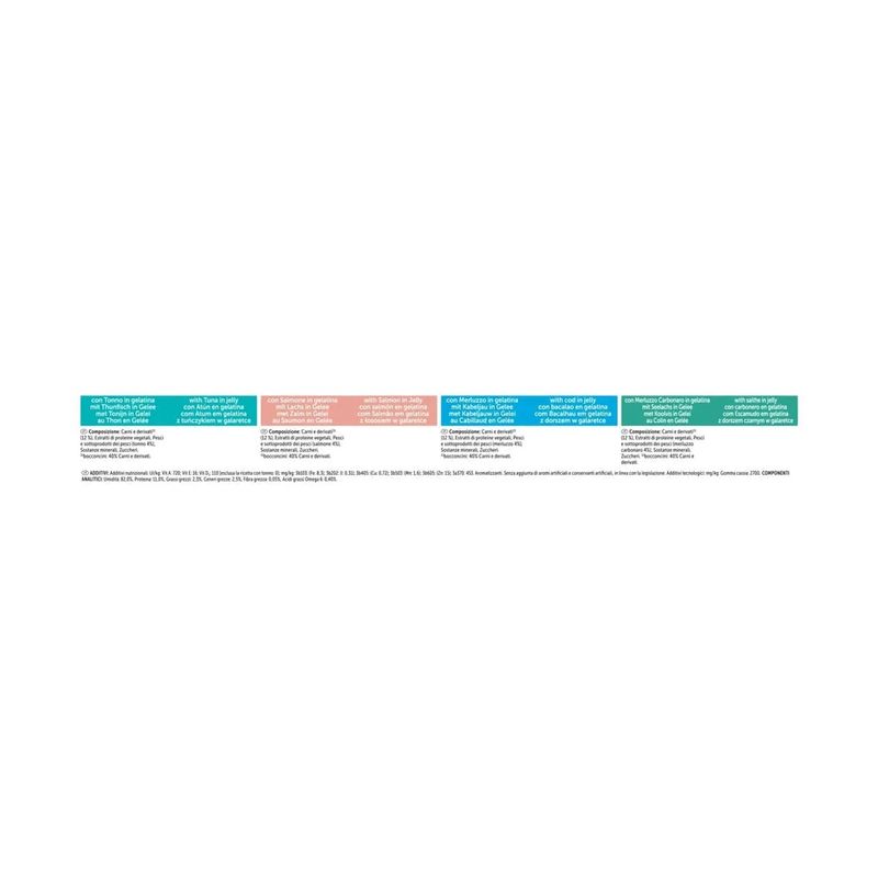 Additivi nutrizionali: UI/kg: Vit A: 720; Vit E: 16; Vit D3: 110 esclusa la ricetta con tonno: 0; mg/kg: 3b103: (Fe: 8,3); 3b202: (I: 0,31); 3b405: (Cu: 0,72); 3b503: (Mn: 1,6); 3b605: (Zn: 15); 3a370: 453. Aromatizzanti. Senza aggiunta di aromi artificiali e conservanti artificiali, in linea con la legislazione. Additivi tecnologici mg/kg: Gomma cassia: 2700.