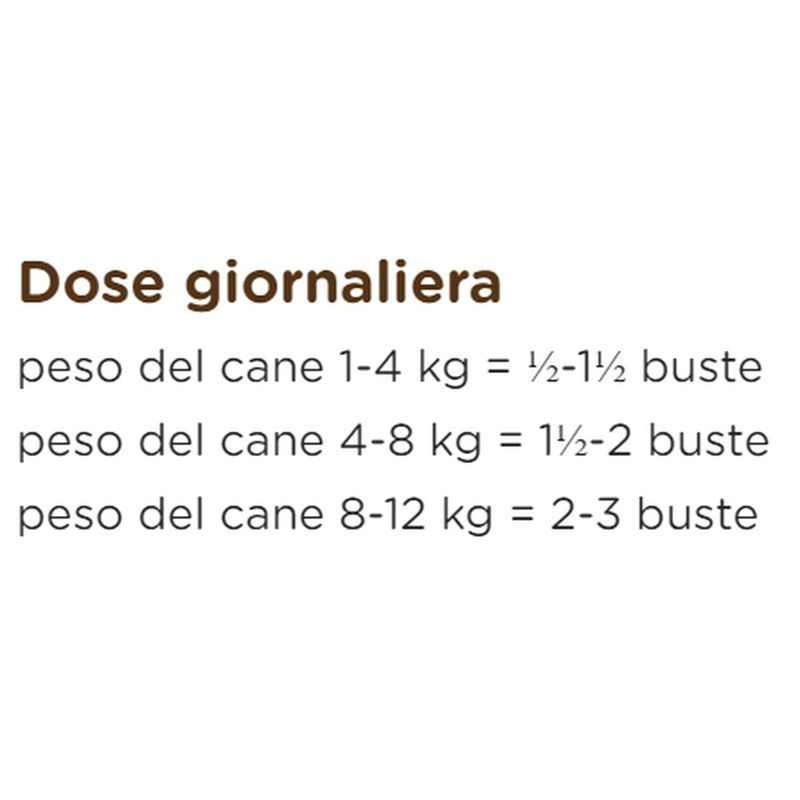 N.B. Il prodotto è disponibile nel formato busta multipack 12x150G, nei seguenti gusti: Manzo e mirtillo, Pollo, Prosciutto, Tacchino e zucchine, Vitello e bietole.