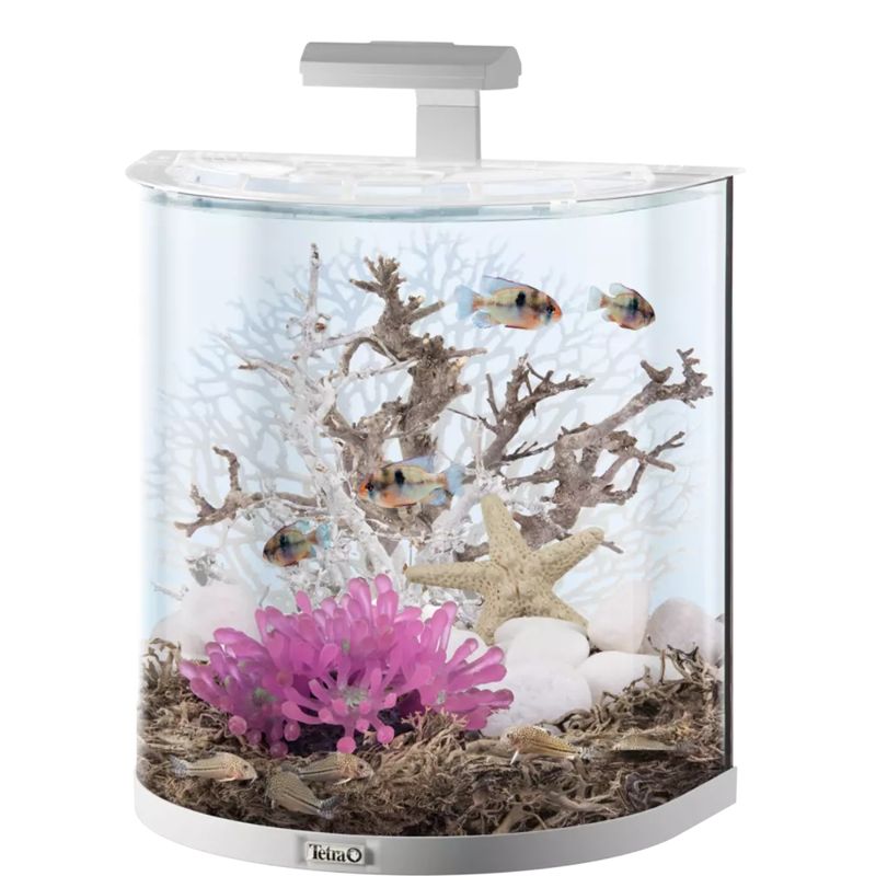 60LAquaart Explorer Line Led Bianco è un set di acquario completo per pesci e gamberi di fiume con vasca dall'affascinante design a mezzaluna e vetro anteriore ricurvo a 180°. L'acquario è dotato di potente illuminazione LED da 6 Watt con durata utile di ben 50.000 ore e un interruttore per le modalità luce diurna e notturna. Questo lo rende perfetto per pesci, gamberi di fiume e piante. L'acquario Tetra AquaArt Explorer Line è realizzato con un vetro di 6 mm di spessore di alta qualità. Inoltre, è dotato di coperchio trasparente di alta qualità in resina acrilica con sportello integrato per semplificare l'alimentazione di pesci e gamberi di fiume. Il set dell'acquario comprende anche il filtro top di gamma Tetra EasyCrystal FilterBox che garantisce acqua pulita a lungo. Questo crea le migliori condizioni di vita possibili per pesci e gamberi di fiume, specialmente se alimentati con mangime bilanciato e di altissima qualità. Il filtro è facile da installare e subito pronto all'uso. Il design ricurvo dell'acquario offre una vista incredibilmente ampia sull'affascinante mondo sottomarino.