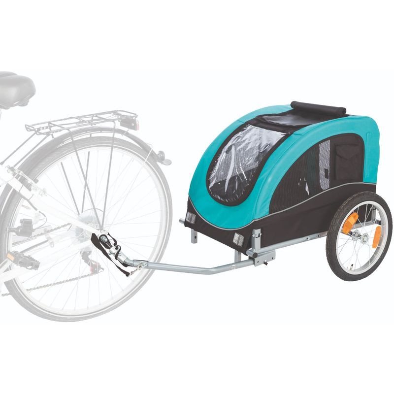 Trailer per bicicletta Trixie, è un trailer per bicicletta pieghevole, realizzato in acciaio e con fodera in poliestere. Possiede due ruote con sistema rapido di montaggio, un'apertura anteriore e posteriore e un'inserto in rete richiudibile sul tetto.