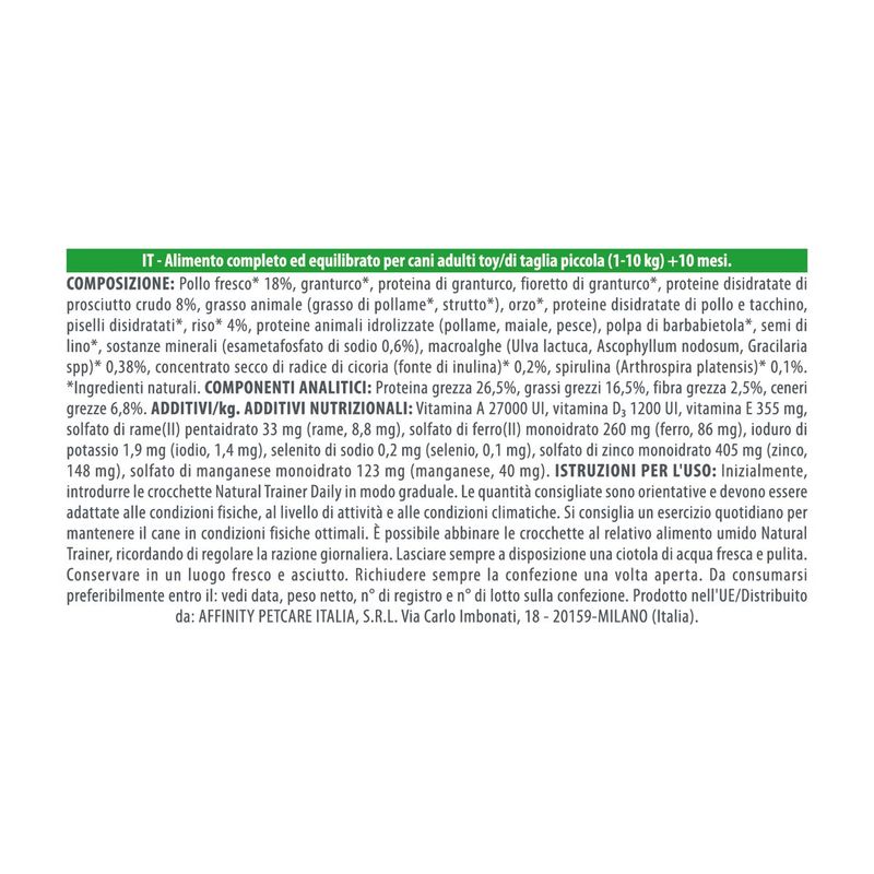 Natural Trainer Adult Small & Toy con Prosciutto Crudo si rinnova con nuovo pack e nuova formulazione. Potresti ricevere il nuovo o il vecchio pack in base alle disponibilità in magazzino.