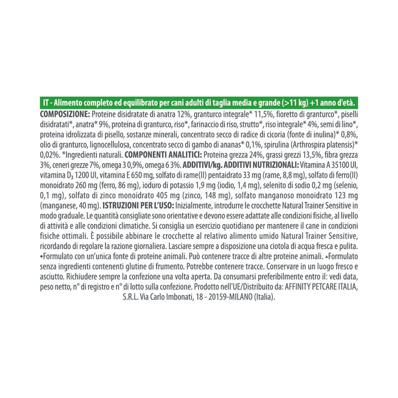 Natural Trainer Sensitive No Gluten Adult Medium Maxi Anatra è un alimento secco completo ed equilibrato appositamente formulato per cani adulti di taglia media e grande con particolare sensibilità digestiva. Preparate con cura e dedizione, queste crocchette sono un concentrato di ingredienti naturali, studiati per favorire la funzionalità digestiva e promuovere il benessere generale del tuo cane. Questo alimento senza glutine e senza coloranti, conservanti e zuccheri aggiunti e con ingredienti altamente digeribili contiene la carne di anatra come sola fonte di proteina animale di alta qualità, inoltre l’estratto di ananas 100% naturale presente nella composizione di questo alimento, aggiunge un tocco di freschezza e contribuisce ad un processo digestivo più efficiente, garantendo che il tuo cane possa godere appieno di ogni pasto. I cereali integrali forniscono fibre essenziali che supportano la salute intestinale, i prebiotici stimolano la crescita di batteri benefici nell'intestino, mentre gli acidi grassi Omega 3 provenienti dai semi di lino supportano la salute della pelle e del pelo, contribuendo a mantenere il manto del tuo cane lucido e sano. Inoltre, la presenza di Boswellia serrata aiuta a prendersi cura delle articolazioni, fornendo al tuo cane il supporto necessario per mantenere una mobilità agevole e confortevole nel corso degli anni. Infine, l'alga spirulina, le proteine, i minerali e le vitamine contenute in queste crocchette aiutano a supportare la vitalità generale del tuo cane, assicurandoti di avere un compagno pieno di energia e vitalità.