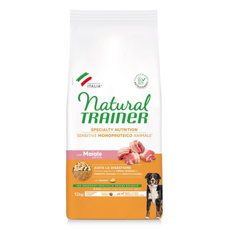 Natural Trainer Sensitive No Gluten Adult Medium Maxi Maiale è un alimento secco completo ed equilibrato appositamente formulato per cani adulti di taglia media e grande con particolare sensibilità digestiva. Preparate con cura e dedizione, queste crocchette sono un concentrato di ingredienti naturali, studiati per favorire la funzionalità digestiva e promuovere il benessere generale del tuo cane. Questo alimento senza glutine e senza coloranti, conservanti e zuccheri aggiunti e con ingredienti altamente digeribili contiene la carne di anatra come sola fonte di proteina animale di alta qualità, inoltre l’estratto di ananas 100% naturale presente nella composizione di questo alimento, aggiunge un tocco di freschezza e contribuisce ad un processo digestivo più efficiente, garantendo che il tuo cane possa godere appieno di ogni pasto. I cereali integrali forniscono fibre essenziali che supportano la salute intestinale, i prebiotici stimolano la crescita di batteri benefici nell'intestino, mentre gli acidi grassi Omega 3 provenienti dai semi di lino supportano la salute della pelle e del pelo, contribuendo a mantenere il manto del tuo cane lucido e sano. Inoltre, la presenza di Boswellia serrata aiuta a prendersi cura delle articolazioni, fornendo al tuo cane il supporto necessario per mantenere una mobilità agevole e confortevole nel corso degli anni. Infine, l'alga spirulina, le proteine, i minerali e le vitamine contenute in queste crocchette aiutano a supportare la vitalità generale del tuo cane, assicurandoti di avere un compagno pieno di energia e vitalità.