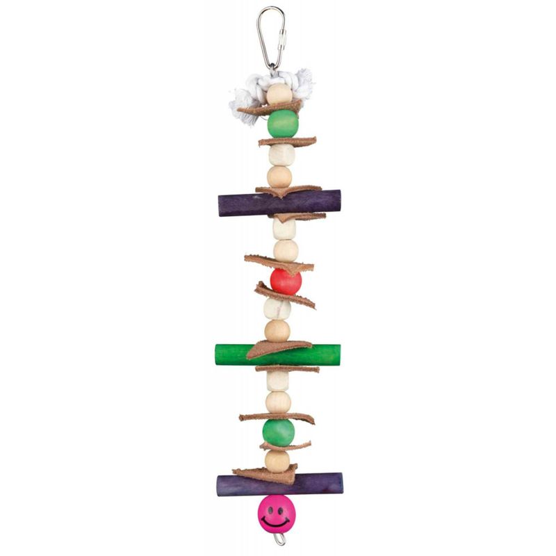 Gioco in legno di Trixie per uccellini come calopsite e cocoriti. È realizzato con corda, cuoio e perline. Multicolore. Misure: 28 cm.