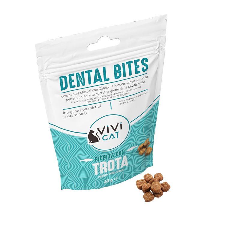 I ViVi Cat Snack Dental Bites 60G sono snack croccanti pensati per il benessere dentale dei gatti adulti di tutte le taglie. Ogni bocconcino è arricchito con vitamina C, succo di mirtillo e microgranuli di calcio che, grazie all’azione meccanica della masticazione, contribuiscono a limitare la formazione di placca e tartaro. Il gusto alla trota rende ogni morso irresistibile, mentre gli ingredienti selezionati offrono benefici concreti alla salute orale del tuo micio. La formula è stata studiata per essere non solo appetitosa, ma anche un valido supporto per l'igiene dentale, aiutando a mantenere l’alito fresco e i denti puliti. Il tutto, ovviamente, senza coloranti e conservanti artificiali, per garantire uno snack sano e sicuro.