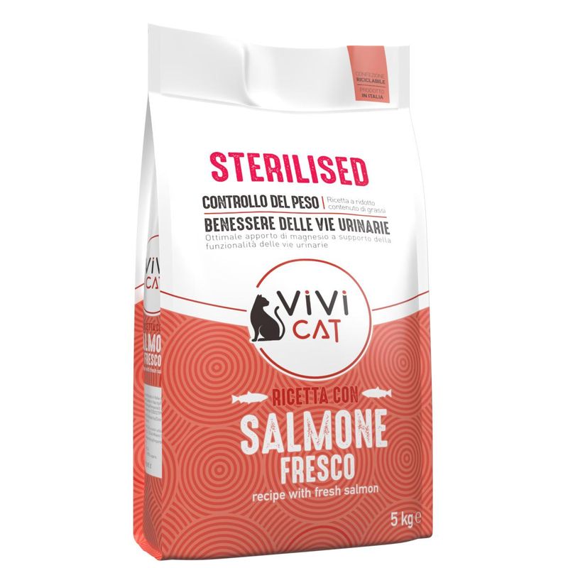 ViVi Cat Sterilised al Salmone Fresco è un alimento secco completo e bilanciato per gatti adulti sterilizzati di tutte le razze e rappresenta la scelta ideale per garantire al tuo felino di casa un'alimentazione sana e gustosa. La ricetta di ViVi Cat Sterilised è priva di conservanti e coloranti artificiali, garantendo un'alimentazione naturale e salutare. Inoltre, è stata formulata senza l'utilizzo di test sugli animali, rispettando così l'etica e il benessere degli animali. Il primo ingrediente è il salmone fresco, che garantisce un elevato valore nutritivo con un apporto ridotto di grassi. Questa formulazione è particolarmente indicata per i gatti sterilizzati, che sono più soggetti a problemi alle basse vie urinarie e all’aumento di peso. Per questo motivo, il livello di magnesio nella ricetta è controllato, contribuendo a mantenere la salute del sistema urinario del tuo gatto. Inoltre, l'aggiunta di MOS, mannanoligosaccaridi, e FOS, frutto-oligosaccaridi, favorisce il benessere dell'intestino, promuovendo una sana digestione e un equilibrio ottimale della flora intestinale.