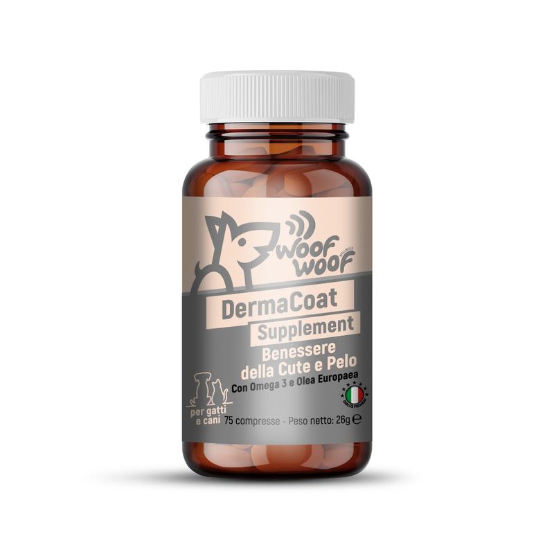 75 COMPRESSEWoof Woof DermaCoat Supplement è un complemento alimentare in compresse per cani e gatti, formulato con Biotina, Zinco, Omega-3 e Olea Europaea per supportare la salute della pelle e migliorare la qualità del mantello.