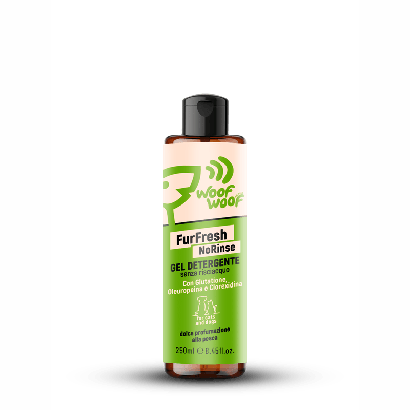 250MLWoof Woof FurFresh Gel Detergente è un gel shampoo senza risciacquo per cani e gatti, formulato con Glutatione, Oleuropeina, Clorexidina, Aloe Vera e Pantenolo (Vitamina B5) per pulire delicatamente il pelo senza acqua, lasciandolo fresco, morbido e profumato.