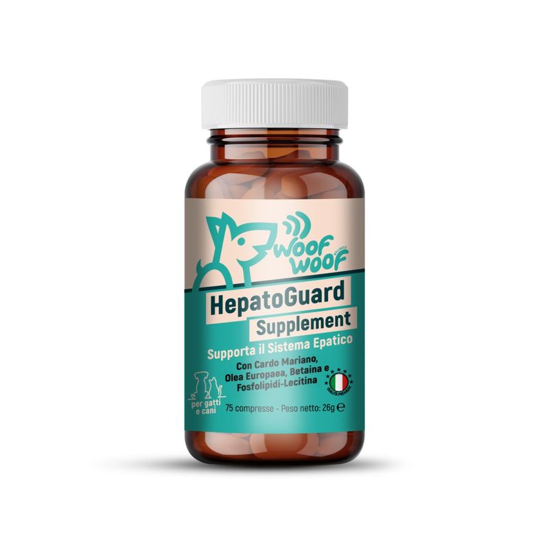 75 COMPRESSEWoof Woof HepatoGuard Supplement è un complemento alimentare in compresse per cani e gatti, formulato con Cardo Mariano, Olea Europaea, Betaina e Fosfolipidi-Lecitina per supportare la salute del fegato e favorire il benessere metabolico.