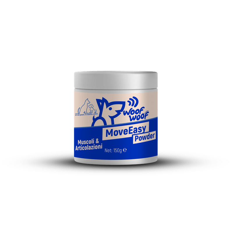 150GRWoof Woof MoveEasy Powder è un complemento alimentare in polvere per cani, formulato con Collagene, Glucosamina e Omega-3 per supportare articolazioni, muscoli e mobilità nei cani giovani, attivi o in crescita.