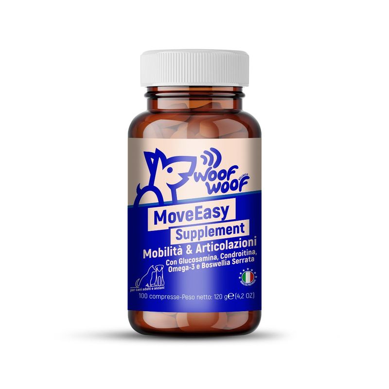 100 COMPRESSEWoof Woof MoveEasy Supplement è un complemento alimentare in compresse per cani adulti e anziani, formulato con Glucosamina, Condroitina e Omega-3 per supportare articolazioni, muscoli e mobilità.