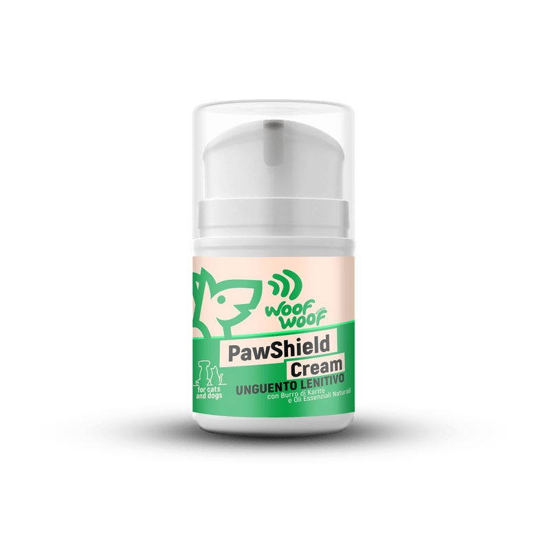 50MLWoof Woof PawShield Cream è una crema lenitiva per zampe e pelle danneggiata di cani e gatti, arricchita con Burro di Karité, Oli Essenziali Naturali, Aloe Vera e Glutatione.
