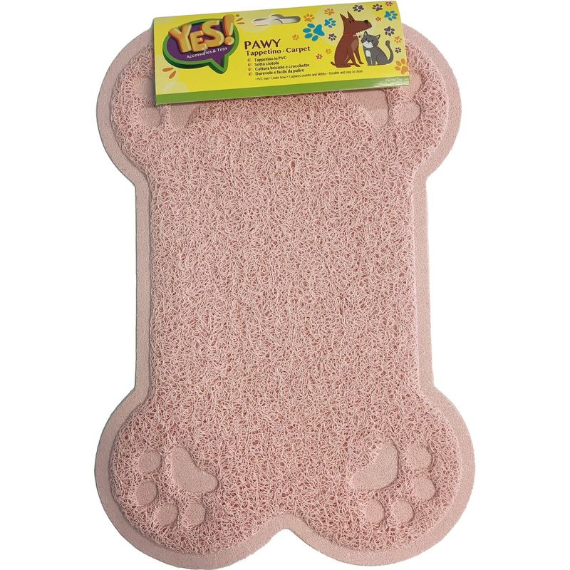 Yes! Tappetino Pawy 40x30CM è un simpatico tappetino a forma di osso, perfetto da usare come sottociotola. È realizzato in PVC, è adatto da posizionare sotto le ciotole del cibo degli animali domestici. È antiscivolo, impermeabile e resistente, è ideale per raccogliere le briciole che possono fuoriuscire dalla ciotola, un aiuto per non sporcare il pavimento di casa. Il materiale in PVC rimane molto facile da tenere pulito, basta anche solo pulirlo con acqua corrente. Le misure del tappetino sono di 40x30CM, è disponibile in diversi colori alcuni opachi e altri sgargianti, praticamente adatto a qualsiasi stile di arredamento.