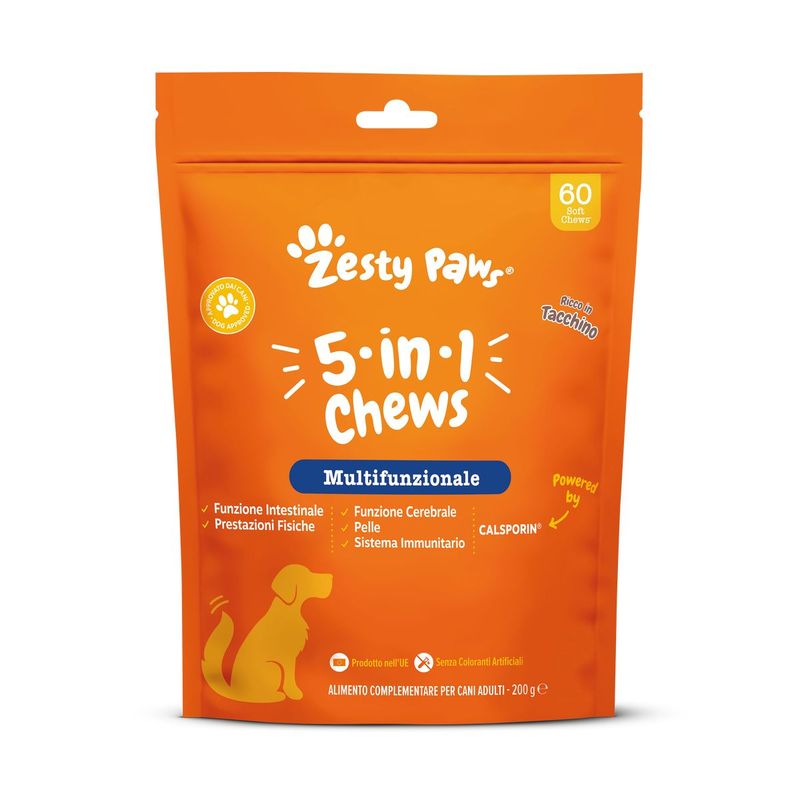 Con Zesty Paws 5 in 1 Chews Multifunzionale Cane Alimento Complementare offrirai un supporto completo, ideale per migliorare la digestione, l'energia, l'immunità e la salute della pelle del tuo cane.